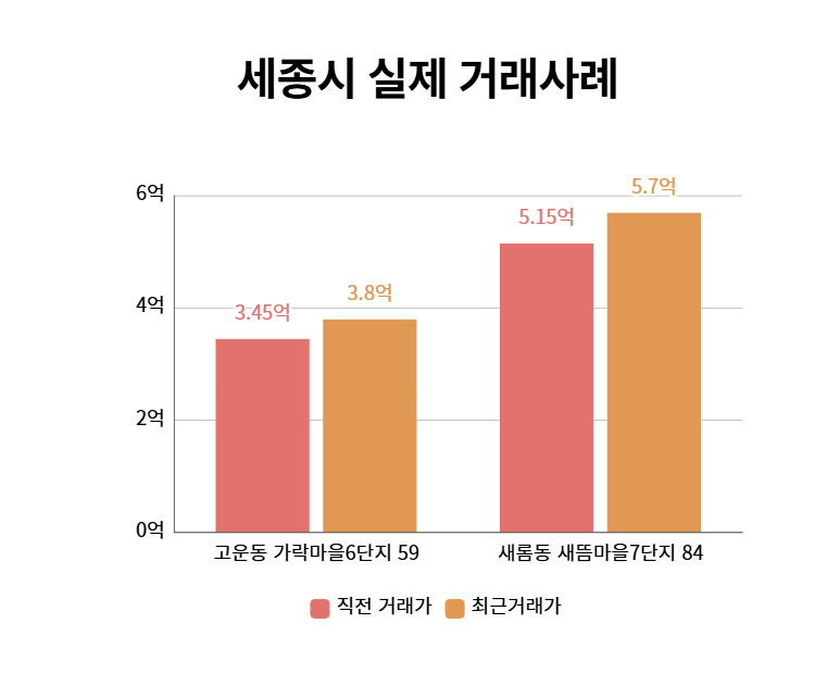 - 새롬동 새뜸마을7단지 전용 84㎡: 직전 거래가 5억1,500만 원 → 최근 거래가 5억7,000만 원 (+11%)