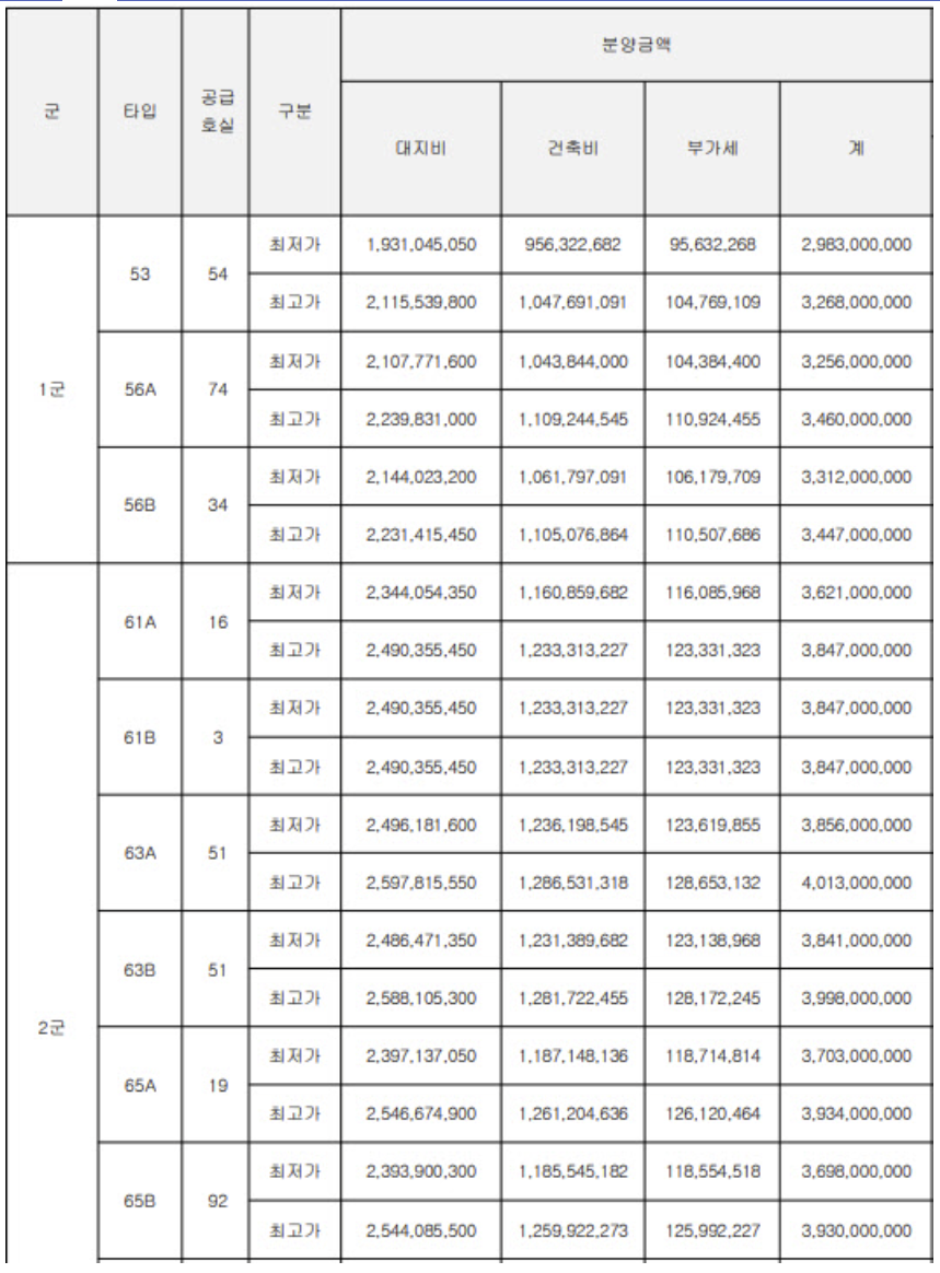 - 1군: 29.8억(53㎡) ~ 34.6억(56A㎡)